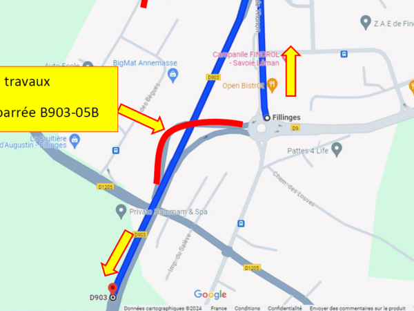 La fermeture concerne les premiers 300 mètres environ de la B903-05B, à l’entrée de Nangy, dans le secteur du péage et des axes reliant la RD 903.